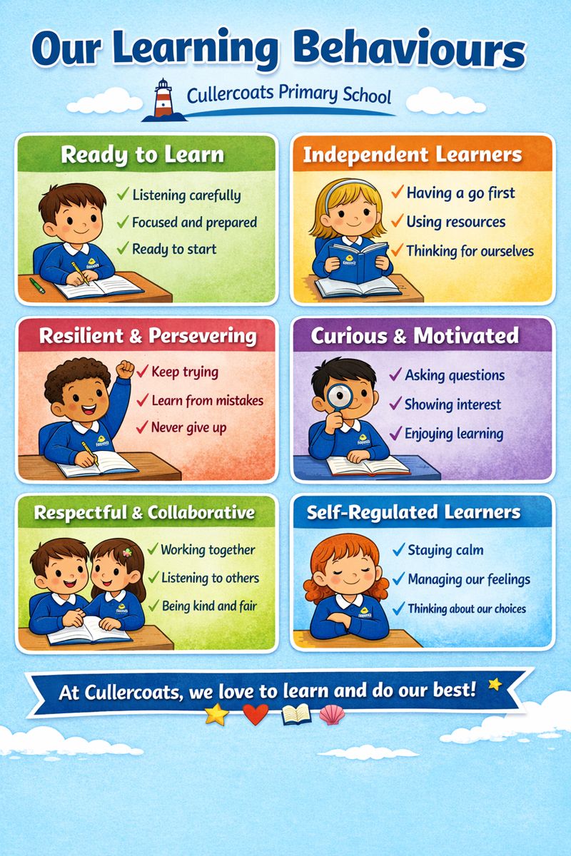 At Cullercoats Primary School, we believe that how children learn is just as important as what they learn. Our learning behaviours underpin everything we do and help our pupils to become confident, resilient and independent learners.